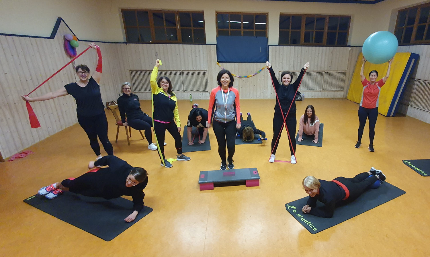Das Trainingsprogramm ist bewusst breit gefächert und bietet für jedes Fitnesslevel das Passende: Step Aerobic, Bauch-Beine-Po, HIIT, Tabata, Gymnastik mit dem Theraband sowie funktionelle Gymnastik stehen regelmäßig auf dem Plan. Bei entsprechender Witterung wird das Training auch mal nach draußen verlegt – zum Beispiel zum Schneeschuhwandern oder Walken.